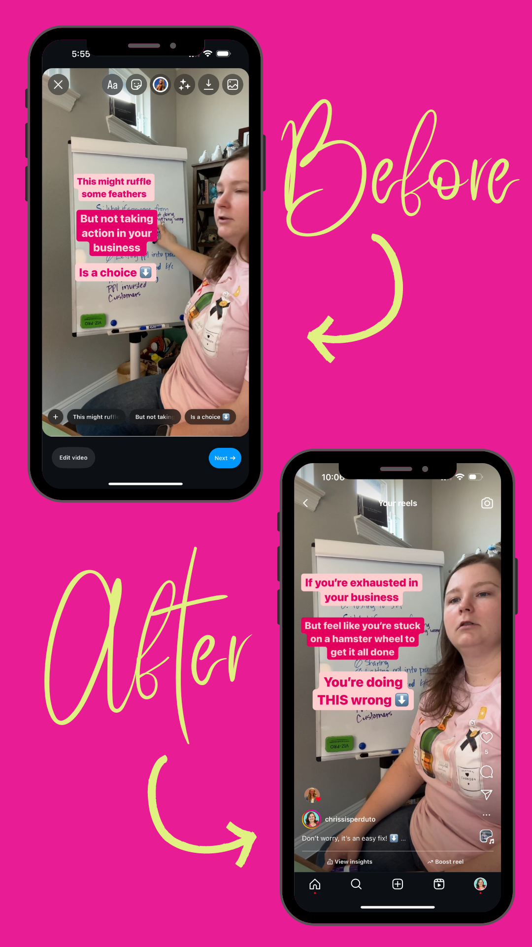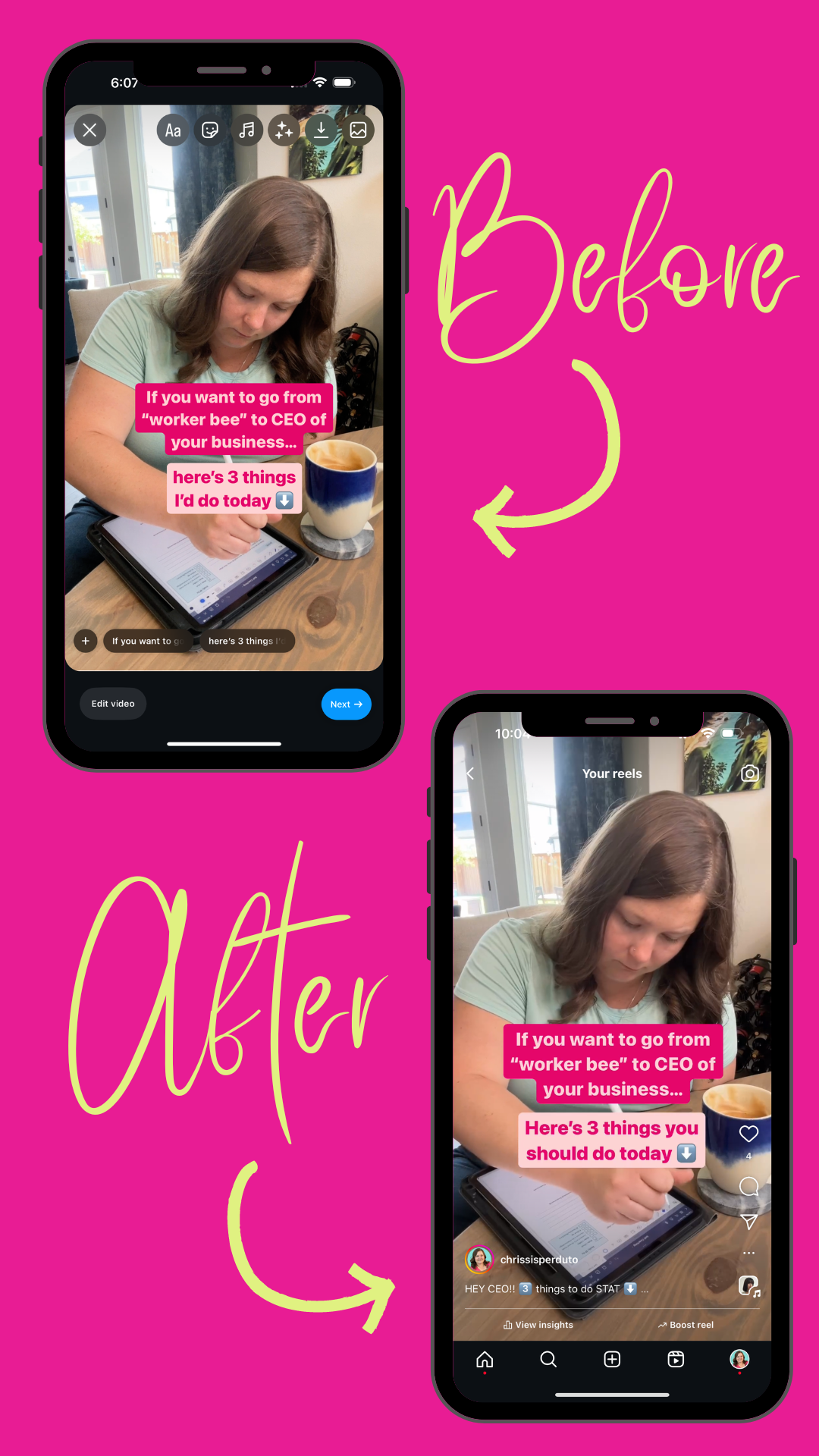 We started playing around with different Reels techniques to see what converted and even spent a month putting out 3 reels per day EACH. The thing that benefited us the most, though, was showing one another the content BEFORE we posted it... making small tweaks and then hitting "post" (sometimes you're just too CLOSE to your own content to realize it doesn't make sense!)